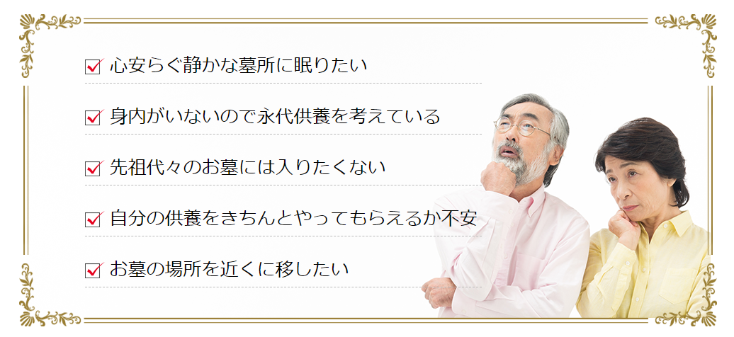人はそれぞれ、ご家庭の事情やご自身が望まれる供養のことなど、さまざまなお悩みを抱えているかと思います。静かな墓所で眠りたい、永代供養をお願いしたいが宗派が違うなどで迷われている方もいらっしゃるでしょう。法要は法式典礼にて行いますが、基本的に宗旨宗派は問いませんので、気兼ねなくお問い合わせください。悩みを抱えられている方一人ひとりが救われるよう、住職が優しくしっかりと寄り添ってまいります。